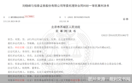 具体来看,判决书显示,自2019年2月24日至今,中经宏熙陆续支付了大部分本金和部分收益。但在2021年1月中经宏熙发布公告称,因业务原因涉诉被执行,账户被冻结,公司承诺保障投资人本金及自基金成立到收到全部本金及合法收益不受损失。不过刘某表示,其共计投入本金720万元,已收到返还的投资本金668.08万元,剩余投资本金51.92万元。已经收到返还的投资收益67.68万元。关于收益,按中经宏熙法定代表人李诚在微信群中的12%承诺收益,刘某主张应为暂计至2022年6月25日的29.18万元。就未收回款项,投资者将中经宏熙及恒泰证券告上法庭。