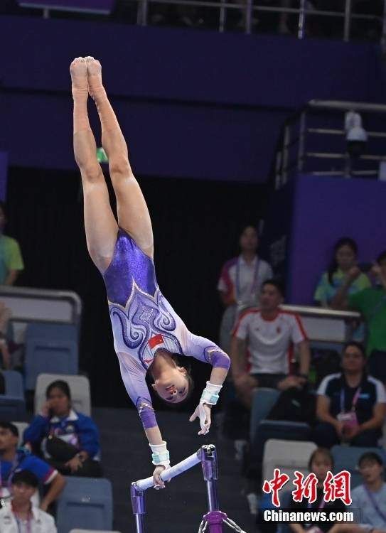 9月27日,杭州第19届亚运会竞技体操女子全能决赛在黄龙体育中心体育馆举行。中国选手左彤以53.565分获得金牌,帮助中国队成功卫冕该项目亚运会冠军。图为左彤进行高低杠比赛。中新社记者 安源 摄