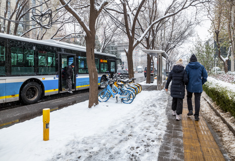 雪中,北京公交正常安全运行。图为朝阳区四得公园公交站416路公交车正在上下乘客。刘玉松摄