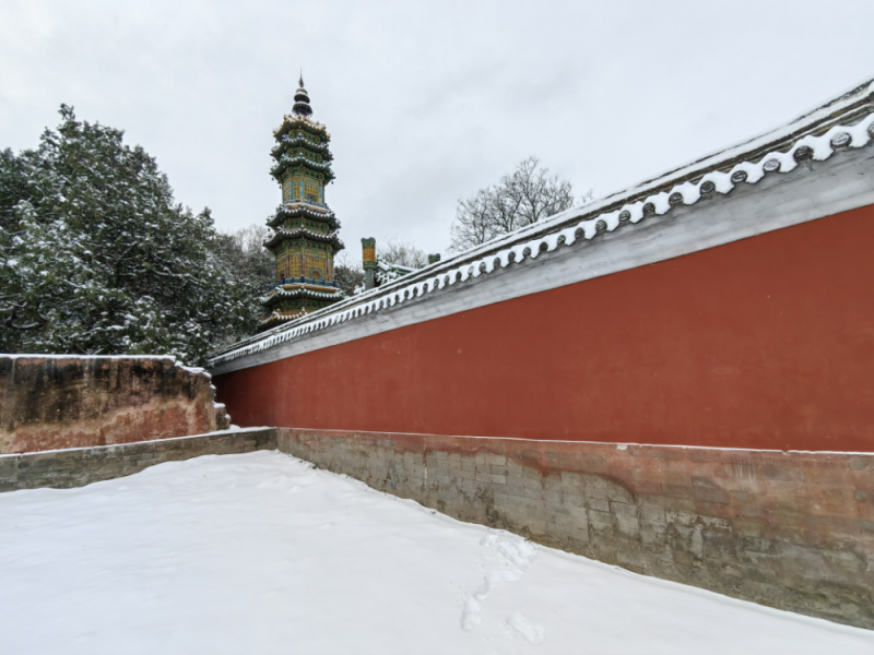 颐和园后山,白雪、红墙的映衬下,多宝琉璃塔显得格外晶莹。王珺燕摄