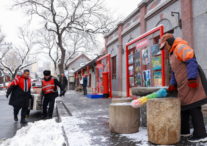 京西街头,人们逛古道、赏雪景;与此同时,环卫工人加紧扫雪,为人们创造出行条件。王春山摄