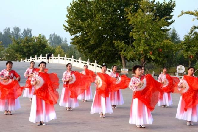 群众在龙港公园进行扇子舞表演(胡宇婷 摄)