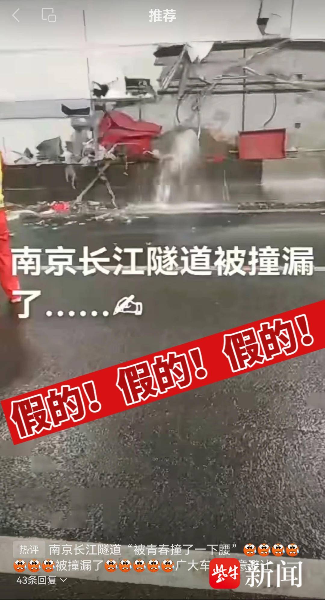 记者从南京交通运营管理集团获悉,9月27日上午网上流传“南京长江隧道被撞漏了”的不实信息,请广大网友不要相信,撞破的是消防水管,并已于当日凌晨维修完毕,该隧道当日早晨6点已恢复正常交通,请广大市民放心通行。