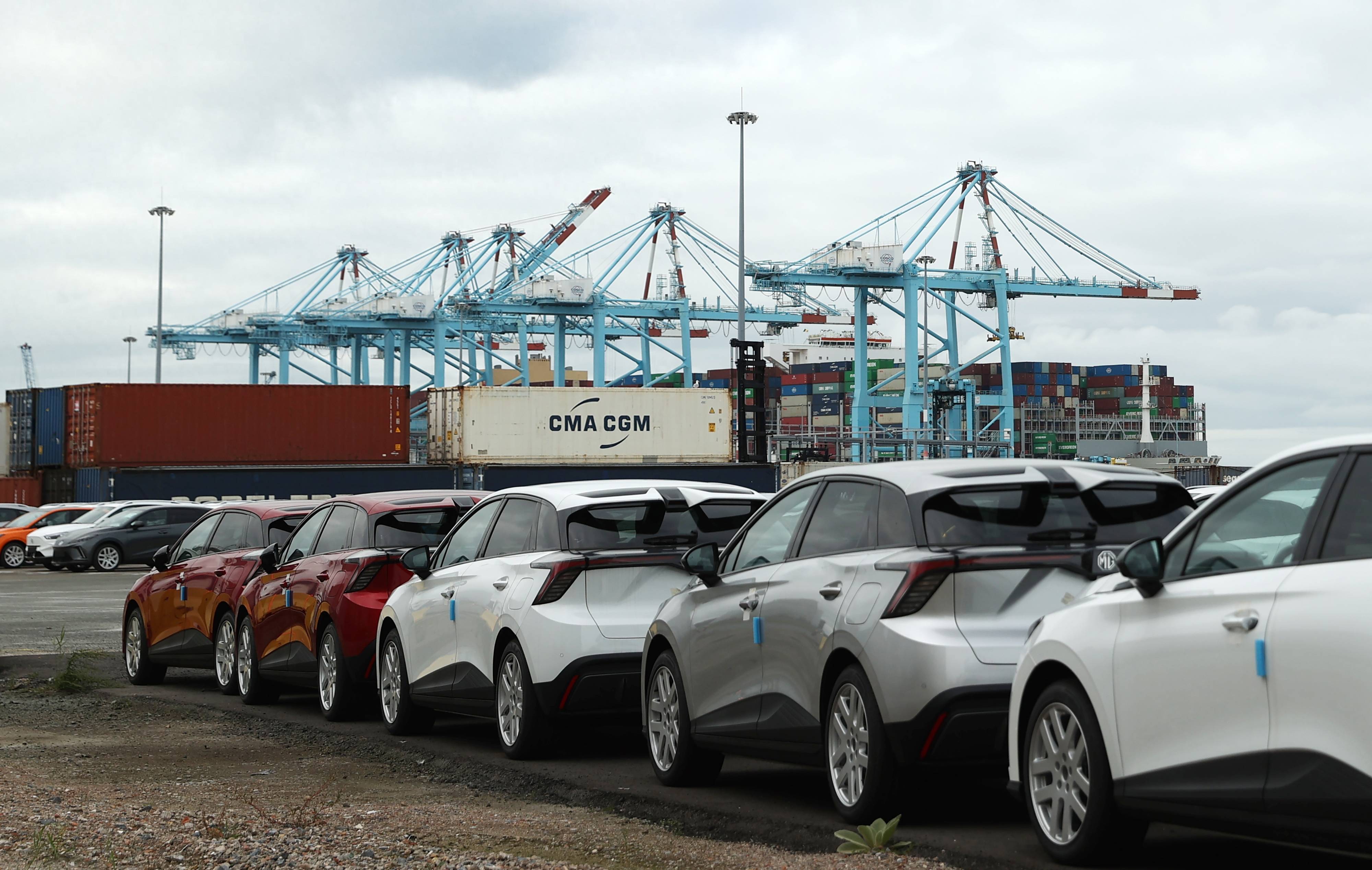 9月25日,一艘货轮停靠在比利时安特卫普-布鲁日港中远海运(港口)泽布吕赫码头。 新华社记者 赵丁喆 摄