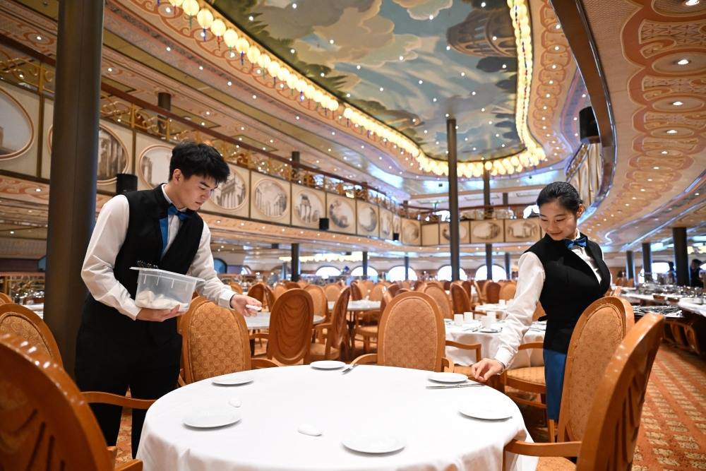 9月27日,中国船舶集团旗下爱达邮轮“地中海”号邮轮工作人员在邮轮餐厅忙碌。新华社记者赵子硕摄