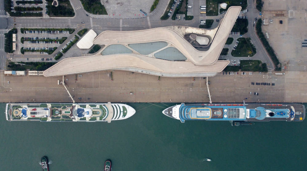 9月27日,天津东方国际邮轮有限公司旗下“梦想”号邮轮(左)、中国船舶集团旗下爱达邮轮“地中海”号邮轮靠泊在天津国际邮轮母港准备启航(无人机照片)。新华社记者赵子硕摄