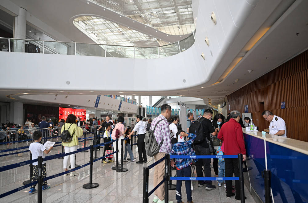 9月27日,游客在天津国际邮轮母港办理登船手续。新华社记者赵子硕摄