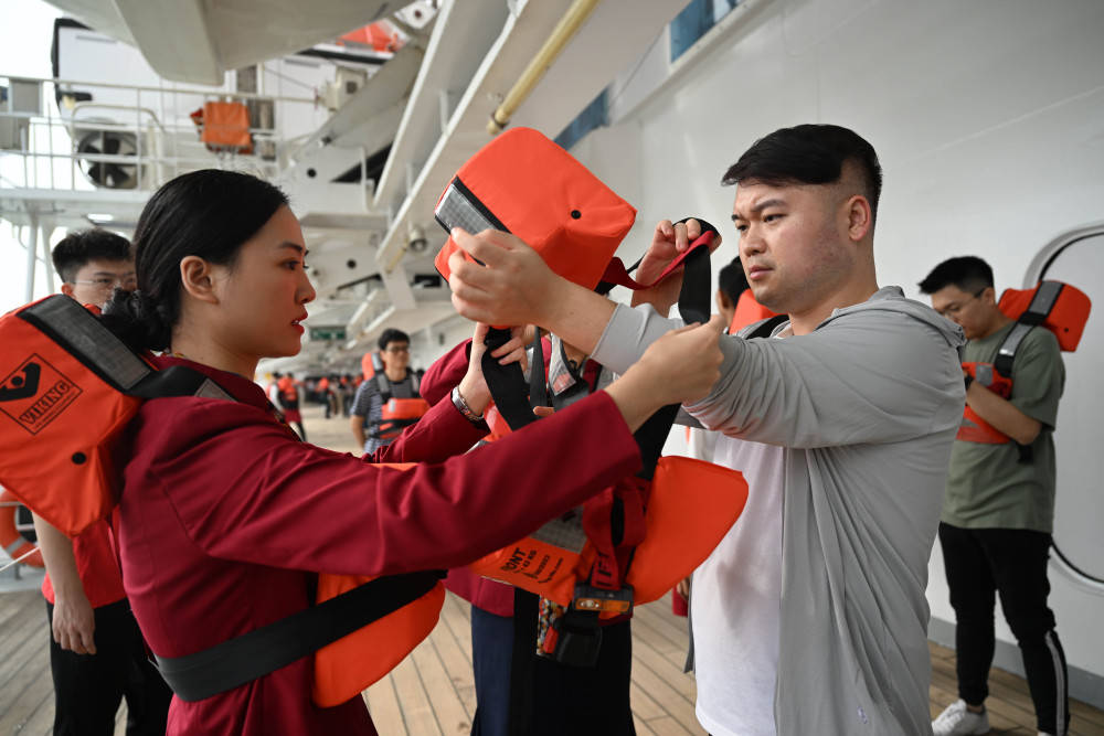 9月27日,在中国船舶集团旗下爱达邮轮“地中海”号,工作人员指导游客进行安全演习。新华社记者赵子硕摄