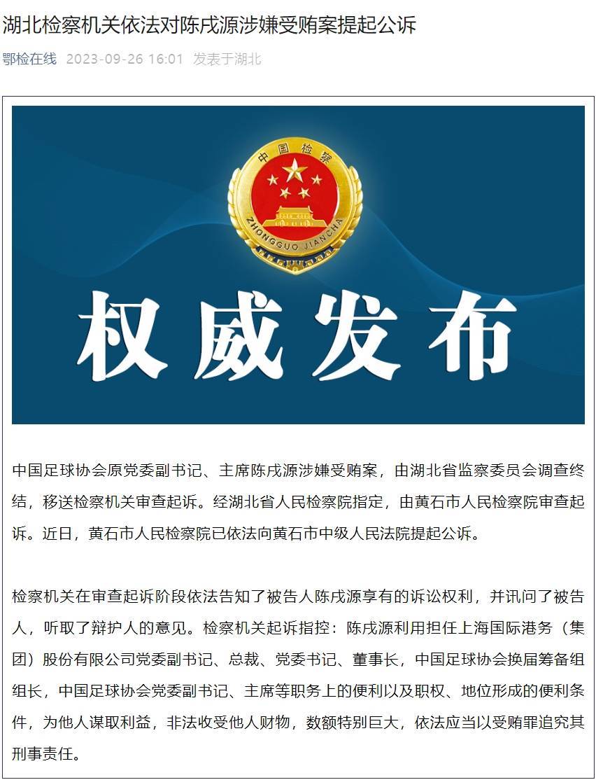 直播吧9月26日讯 湖北检察机关今日官方宣布,依法对前中国足协主席陈戌源提起公诉。