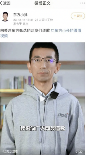 【央视新闻客户端】 12月14日傍晚,东方甄选CEO孙东旭在微博发布道歉视频,对自己近日在直播中神态“咄咄逼人”以及把手机放在桌上的动作、提到董宇辉的薪酬等行为向网友道歉,自己提到董宇辉的薪酬是“不职业”的表现。 孙东旭表示,近日自己所说的“拒绝饭圈文化”并不是说东方甄选的粉丝是饭圈。“网友粉丝是我们的衣食父母,一定更加努力,为大家提供更加完善的服务。” 14日下午,新东方创始人俞敏洪也在个人社交平台发声明称,这两天东方甄选的问题成了大家议论的热点。“小编作为员工,在东方甄选官方账号上发布自己的观点,而且一发再发,这样的做法严重缺乏职业精神,也说明公司管理上有很大的漏洞。”俞敏洪说。 同时,俞敏洪表示,孙东旭在对问题进行解释时,提及董宇辉薪酬的行为不恰当,自己作为董事长负有领导责任,也向董宇辉表达了歉意。 有关“饭圈文化”,俞敏洪回应称,自己此前从来不知道什么是“饭圈文化”。他不认为东方甄选有什么“饭圈文化”也坚决抵制“饭圈文化”。东方甄选拥有的都是热爱东方甄选和主播们的网友粉丝。 “我希望所有主播的粉丝能用理性的言论追星,也希望网友能用更宽容的方式对待东方甄选。”俞敏洪说,公司成立还不到两年,员工平均年龄只有二十多岁,现在一言一行都在聚光灯下被放大,给公司运营造成了很大的压力。希望大家给予成长的空间,也欢迎理性的批评建议。 近期,东方甄选小编就“宣传文案出自谁手”与网友发生争执,粉丝不满小编“背刺”董宇辉还抢功,引发董宇辉粉丝和东方甄选的博弈。 12月10日,东方甄选吉林之行收官,董宇辉、东方甄选小编和粉丝有关“小作文”作者的争议屡上热搜。“一些网友好奇文案出自谁手?”该平台小编称,“每一次小作文制作,都是主播在镜头前,背后是文案创作团队、拍摄团队、剪辑团队的小伙伴们,大家协作,才有了一篇专场小作文。”董宇辉的粉丝却不买账,认为这是东方甄选背刺董宇辉之举。 之后孙东旭就此发声,称网上的部分言论有点偏激,否认了其他主播和幕后团队创作的努力和贡献。他认为,这种极端的观点是捧杀和拉踩,给其团队造成了很大的困扰。但随后,孙东旭主动提到了董宇辉的工资情况,并透露,上市公司财报中董宇辉一年收入数千万元只是其收入中的一部分,“公司一直在用实际行动表达对宇辉的高度认可”。 13日凌晨,董宇辉发长文回应称,“小作文”有自己写的,也有小编团队写的。他还声明自己反对饭圈文化,拒绝以饭圈名义污名化任何人。同时,记者注意到,14日,董宇辉抖音主页已将签名更改。此前,其个人签名为“曾经是老师,现在是售货员”,现在改成“勿意,勿必,勿固,勿我”。 “小作文”之争,直接影响了东方甄选的市场表现。12月14日,东方甄选账号粉丝数为3090.7万,累计掉粉近26万。而在12月9日,东方甄选粉丝数为3116万人。此外,东方甄选3个交易日股价累计下跌14%。