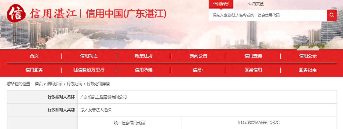 近日,信用中国(广东湛江)网站发布一条处罚信息,涉及广东佰凯工程建设有限公司。具体信息如下: