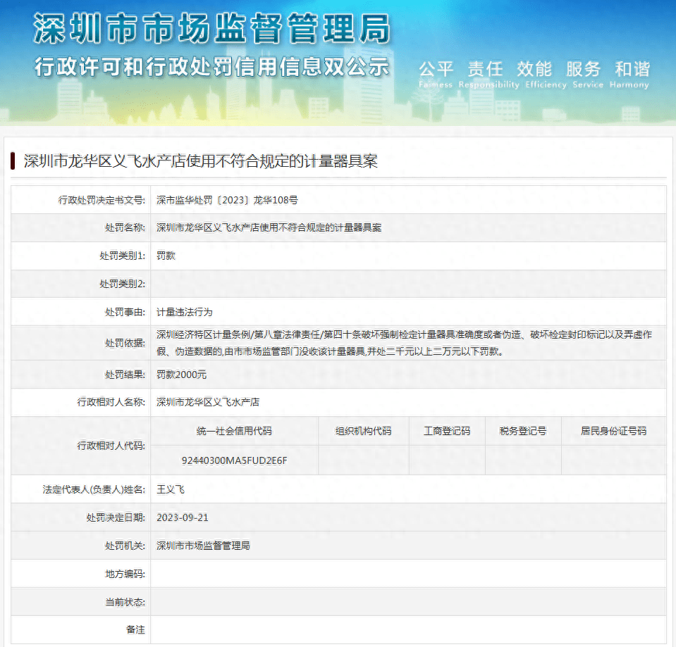 近日,深圳市市场监督管理局发布行政处罚信息(深市监华处罚〔2023〕龙华108号),涉及深圳市龙华区义飞水产店使用不符合规定的计量器具案。