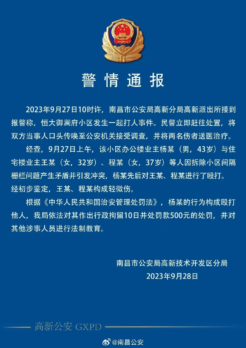 28日,南昌市公安局高新技术开发区分局就此事发布《警情通报》。《通报》称,事情发生在恒大御澜府小区,27日10时许,派出所民警接到报警后,立即赶往处置,将双方当事人口头传唤至公安机关接受调查,并将两名伤者送医治疗。