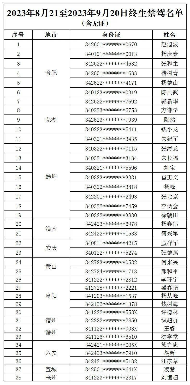 此次曝光的新增38名终生禁驾人员中(其中无证人员5名),28人(其中无证人员5名)是因交通肇事逃逸构成犯罪,10人是因饮酒或者醉酒驾驶机动车发生重大交通事故构成犯罪。因上述犯罪被追究刑事责任的38人中,有机动车驾驶证的33人被吊销机动车驾驶证,且所有人都终生不得再申领机动车驾驶证。