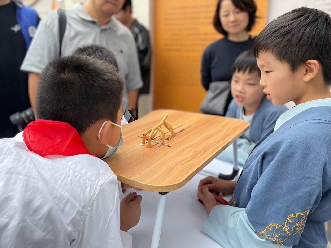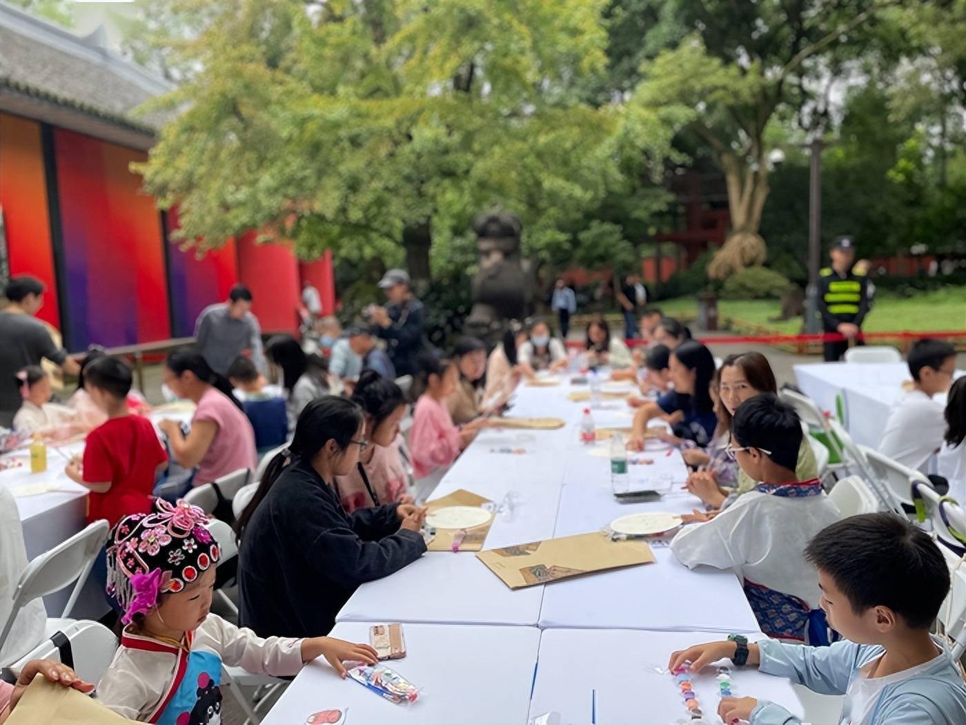 上午10点,“中秋游园”活动开始。“花好月圆时,中秋意正浓”,身着汉服的小朋友手提“兔儿灯”,巡游来到观众身边,吟诵国学经典,送出中秋祝福。三义庙前,人头攒动,来自成都市青少年宫的小朋友们带领观众重温旧时光,体验吹洋画、踢毽子、翻花绳、竹节人、抓石子、跳房子等童年趣味游戏,大人小孩全都玩得不亦乐乎。