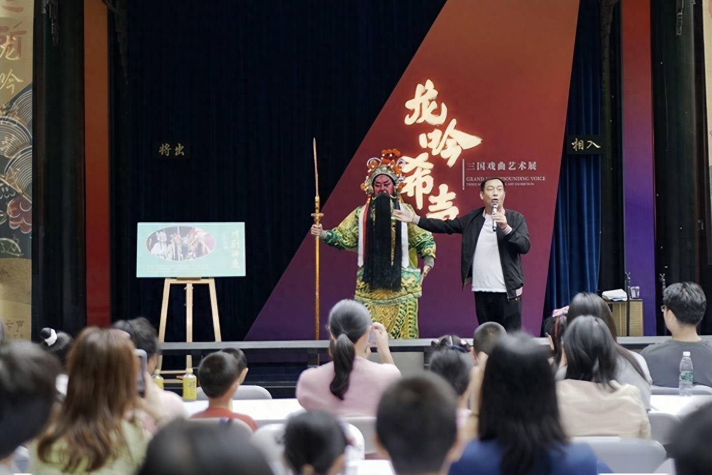 翘首以盼中,“三国匠造所”亲子活动在龙吟希声展厅前拉开序幕。三花川剧团的资深川剧老师带来了精彩的川剧讲座,不仅介绍了川剧的表演手段、程式、声腔和人物脸谱等戏曲小知识,还将川剧表演融入教学中,台下观众看得专注、听得入迷,留下掌声阵阵。随后的手工体验环节将现场气氛推至高潮,家长和孩子都手持颜料和画笔,跃跃欲试。默契的合作,配上大胆的想象,亲子家庭纷纷绘出了独一无二、创意十足的三国人物脸谱扇面。