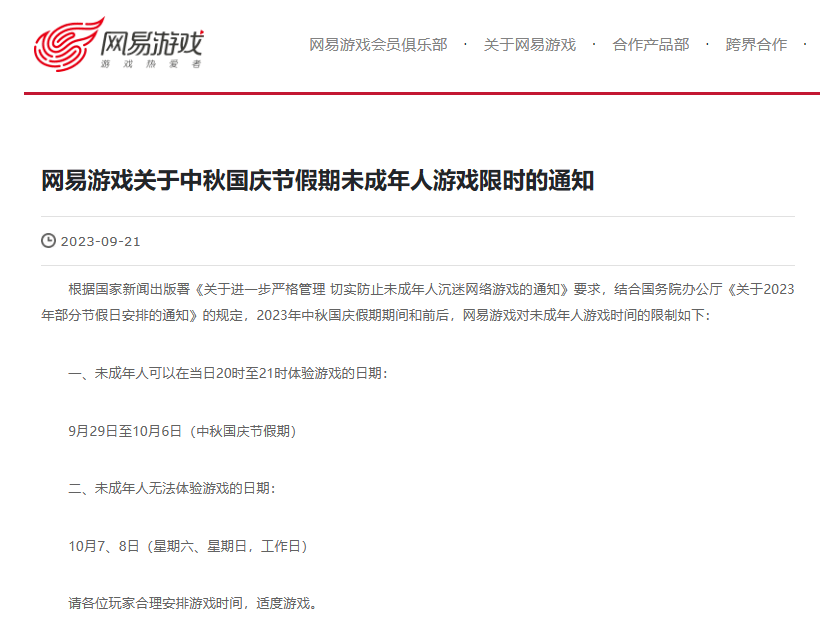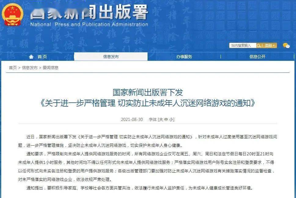 国家新闻出版署于2021年8月下发通知,严格限制向未成年人提供网络游戏服务的时间,所有网络游戏企业仅可在周五、周六、周日和法定节假日每日20时至21时向未成年人提供1小时服务,其他时间均不得以任何形式向未成年人提供网络游戏服务。按照通知的相关限玩规定,其他游戏厂商对于未成年人寒假暨春节假期限玩时间安排将与腾讯游戏一致。