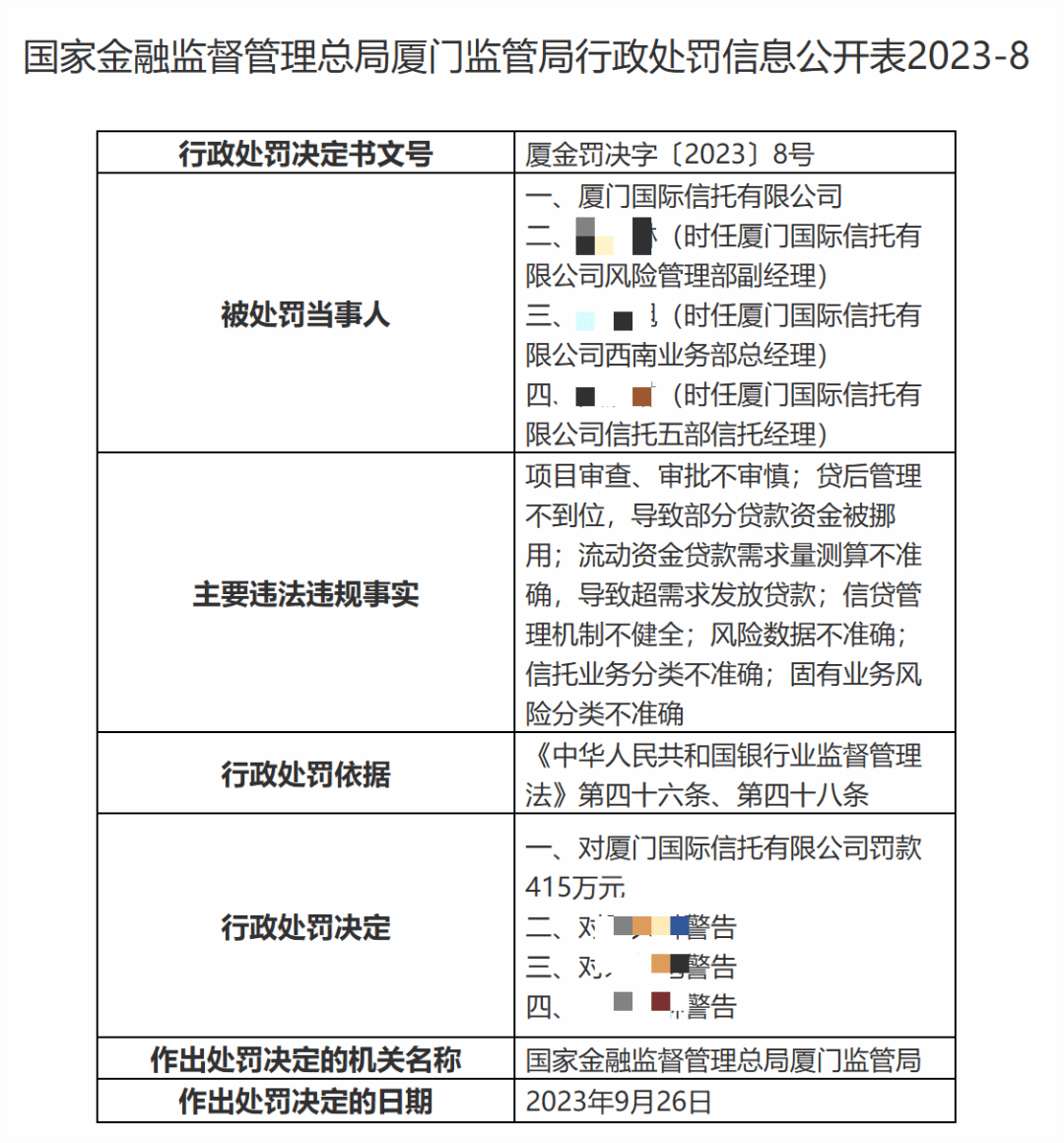 8家金融机构被处罚的理由也都不一样,但定性都是“违法违规行为”。比如厦门国际信托的“七宗罪”包括贷后管理不到位,导致部分贷款资金被挪用;流动资金贷款需求量测算不准确,导致超需求发放贷款;信贷管理机制不健全等。厦门国际银行的原因是发行收益与实际承担风险不相匹配的结构性存款;贷款风险分类不准确;个别贷款“三查”不到位等。