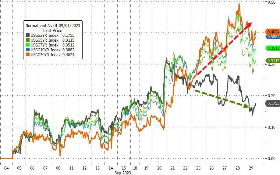 对利率前景更敏感的2年期美债收益率在亚市盘中接近5.08%刷新日高,欧股开盘后总体下行,PCE公布后,美股盘前曾下破5.02%刷新9月15日以来低位,较日高回落超6个基点,远离上周四逼近5.20%而连续三日刷新的2006年以来十七年来高位,到债市尾盘时约为5.04%,日内降近2个基点,连降两日,本周只有周三一日攀升,本周累计下降约7个基点,在连升两周后回落,最近八周内第三周下降,9月升约18个基点,在连降两月后反弹,三季度升约14个基点,连升两个季度。