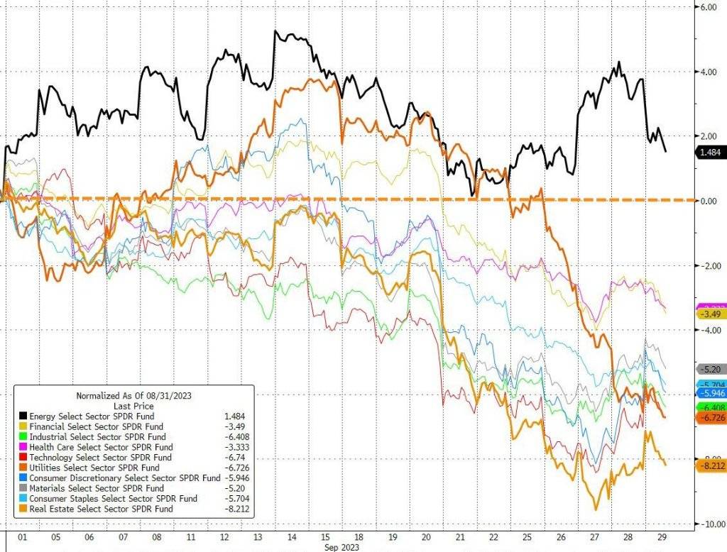 美股主要股指盘中集体转跌,在9月和三季度收官日周五,将回落收官,全月和全季齐跌。美债月度和季度也价格下挫,有“全球资产定价之锚”称号的基准十年期美债收益率周五终结八日连创2007年来新高之势,9月累计升超40个基点、创一年最大月度收益率升幅,凸显美联储保持紧缩、动辄释放进一步加息信号的压力。