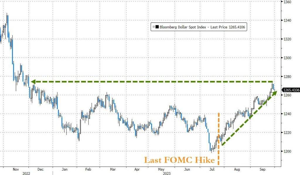 到周五美股收盘时,美元指数处于106.20下方,日内跌不足0.1%。本周累涨近0.6%,9月累涨近2.5%,三季度涨近3.2%;追踪美元兑其他十种货币汇率的彭博美元现货指数微跌,未能靠近周三周三刷新的去年11月末以来十个月高位,和美元指数均在连涨六日后连跌两日,本周涨约0.6%,9月涨逾2%,三季度涨近2.7%。