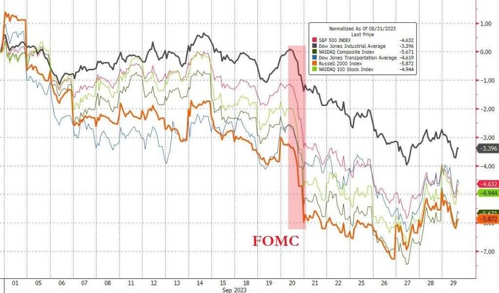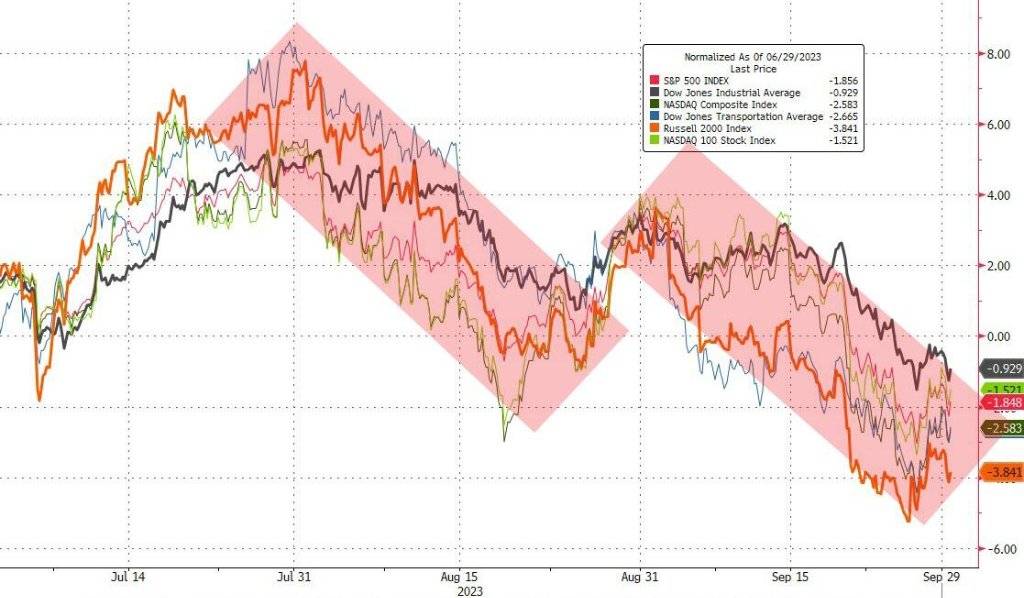 主要股指9月和三季度均累跌。标普累跌4.87%,纳指跌5.81%,纳斯达克100跌5.07%, 在连涨五个月后连跌两个月;罗素2000跌6.03%,连跌两月,和前三个指数均创去年12月以来最大月跌幅;道指累跌3.5%,连跌两月。