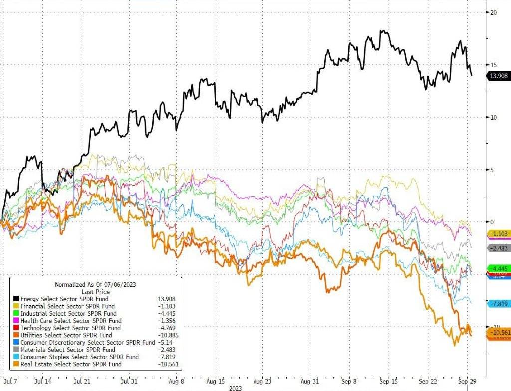 三季度只有两个板块累涨,能源涨超11%,表现最佳,通信服务涨2.8%,公用事业跌约10%领跌,房产跌超9%,必需消费品跌超6%,IT跌近6%,材料和工业跌超5%,非必需消费品跌5%,金融跌超1%,跌幅垫底。