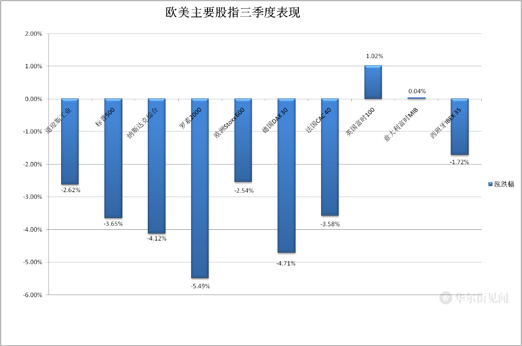三季度斯托克600指数跌约2.5%,创一年来最大季度跌幅,和多国股指均在连涨三个季度后回落,而意股继续累涨,连涨四季,二季度回落的英股反弹。