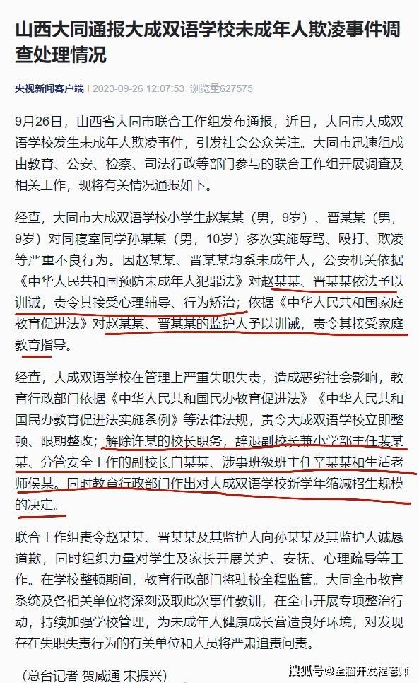 毕竟,在大同大成双语学校霸凌事件中,貌似处罚最重的就是学校方(不管其中有没有背锅的现象)。毕竟一个校长、一个副校长,包括主管的班主任和生活老师都受到了辞退,估计以后找工作都有些困难。