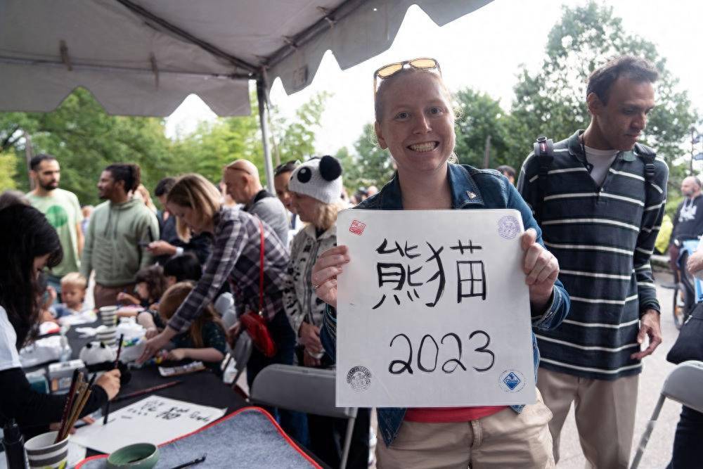 除了看熊猫,由中国驻美国大使馆协办的中国文化展示活动是“告别派对”中最受欢迎的地方。观众可以在这里体验中国书法、试穿汉服、和熊猫玩偶互动合影。