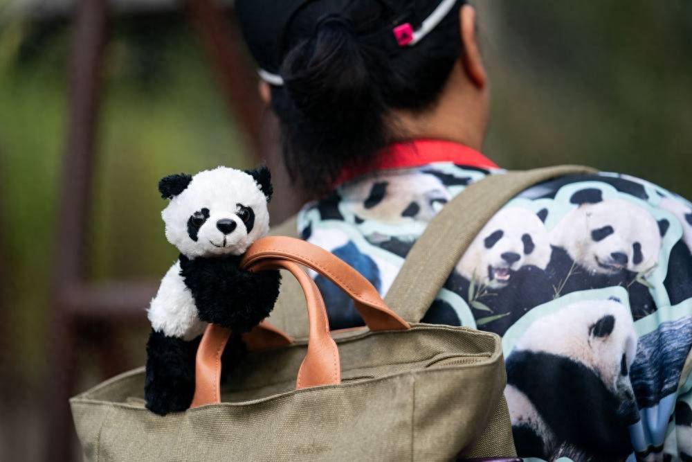 ↑这是9月30日在美国华盛顿史密森学会国家动物园拍摄的游客背包上的大熊猫玩偶。