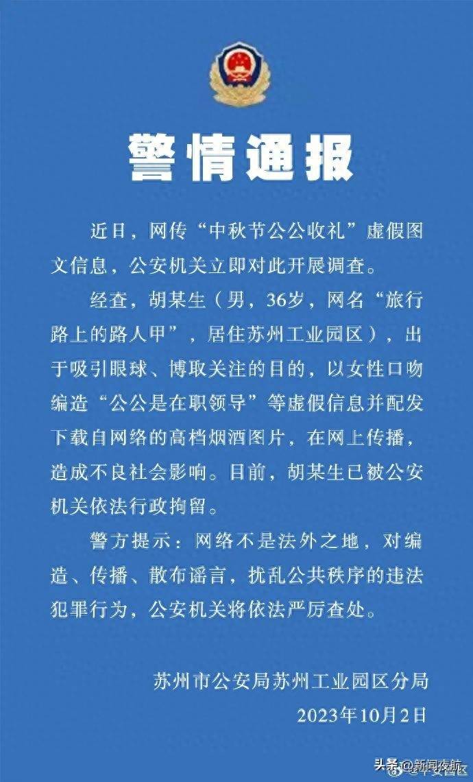 经查,胡某生(男,36岁,网名“旅行路上的路人甲”,居住苏州工业园区),出于吸引眼球、博取关注的目的,以女性口吻编造“公公是在职领导”等虚假信息并配发下载自网络的高档烟酒图片,在网上传播造成不良社会影响。