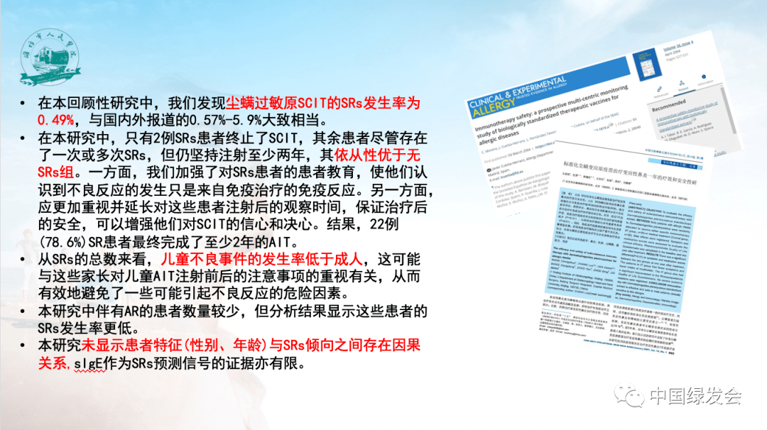 刘凤霞教授通过回顾性分析2013年5月至2018年12月在潍坊市人民医院过敏反应科接受螨变应原SCIT的230例受试者中SRs的数量和发生率,发现尘螨过敏原SCIT的SRs发生率为0.49%,与国内外报道的0.57%-5.9%大致相当。刘凤霞教授在分享时表示: