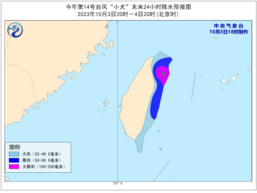 降水预报:3日20时至4日20时,台湾岛东部有大到暴雨,局地有大暴雨(100-200毫米)。