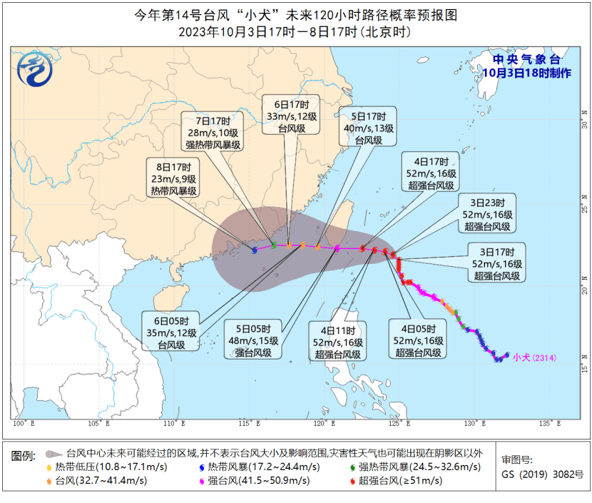 大风预报:3日20时至4日20时,东海西部及钓鱼岛附近海域、台湾以东洋面、巴士海峡、台湾海峡、南海东北部以及浙江沿海、福建沿海、台湾岛沿海将有6-8级、阵风9-10级大风,台湾岛东南部海面、巴士海峡北部海面、台湾海峡东南部海面的风力将有9-12级、阵风13-14级,“小犬”中心经过的附近海面或地区风力可达13-16级,阵风17级。