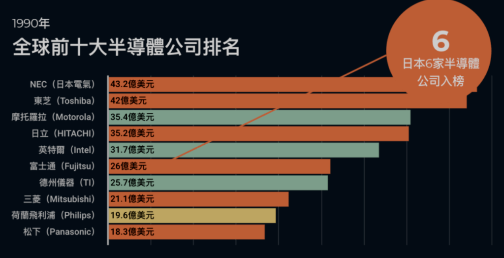 但令美国没想到的是,即便“重拳出击”,日本半导体在90年代初依旧拥有53%的市场份额,1990年的全球十大半导体厂商榜单中,日本企业占据了6席。
