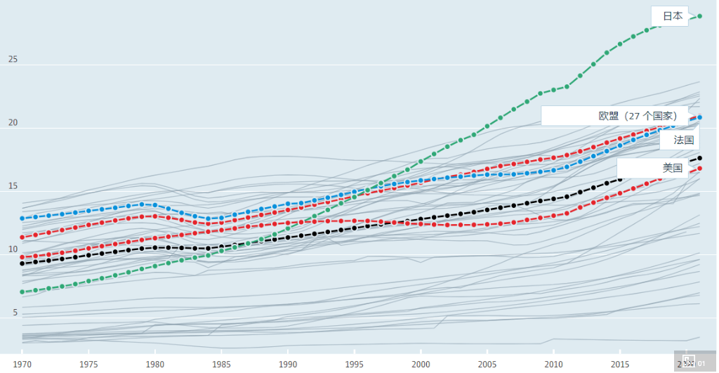 60年代末日本65岁以上人口占总人口比重突破7%,正式步入老龄化社会。80年代中后期日本老龄化程度快速加深,1994年老龄化率突破14%,进入联合国标准下的老龄社会。随后又仅花了12年的时间,老龄化率于2006年超过21%,达到超老龄社会,将全球其他国家远远甩在身后。
