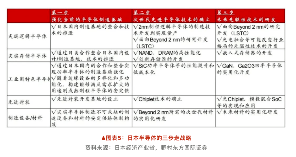 日本将截至2030年半导体产业的复兴分为三个阶段:(1)加快半导体生产的基础设施建设。(2)合作开发下一代半导体技术。(3)立足已有技术,研发具有颠覆性的半导体技术。