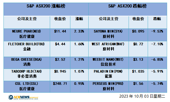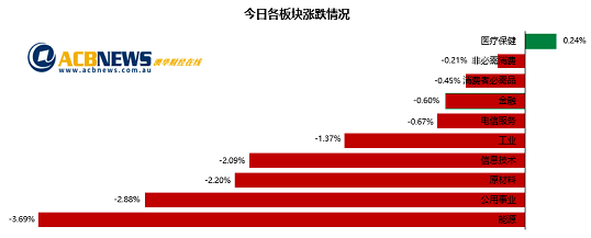 ACBNews《澳华财经在线》10月3日讯 周二,澳洲股市ASX200指数下滑89.8点至6943.4点报收,跌幅1.3%,创3月21日以来最低水平。普通股指下跌94.5点至7141点收盘,跌幅同样为1.3%。就板块表现而言,11个板块中有10个板块下跌,其中能源板块和矿业板块的跌幅均超过2%。