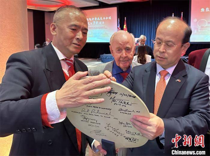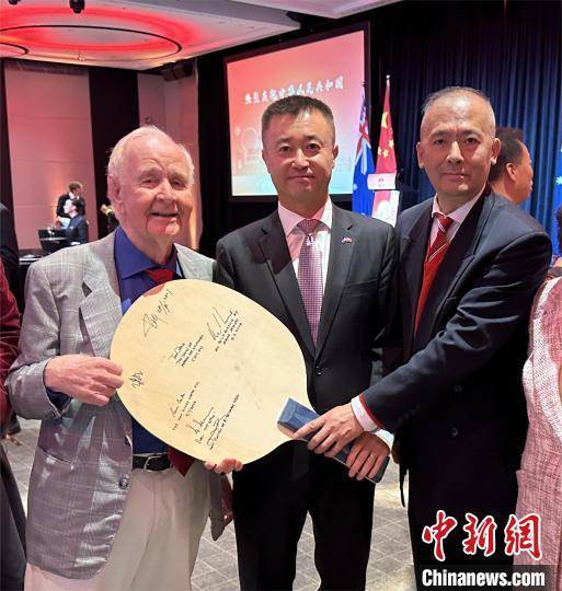9月28日,中国驻澳大利亚使馆与驻悉尼总领馆在悉尼联合举办国庆招待会,隆重庆祝中华人民共和国成立74周年。图为中国驻澳大利亚大使肖千(右)在澳大利亚乒乓老将诺尔(中)的乒乓球板上签字留念。中新社记者 顾时宏 摄