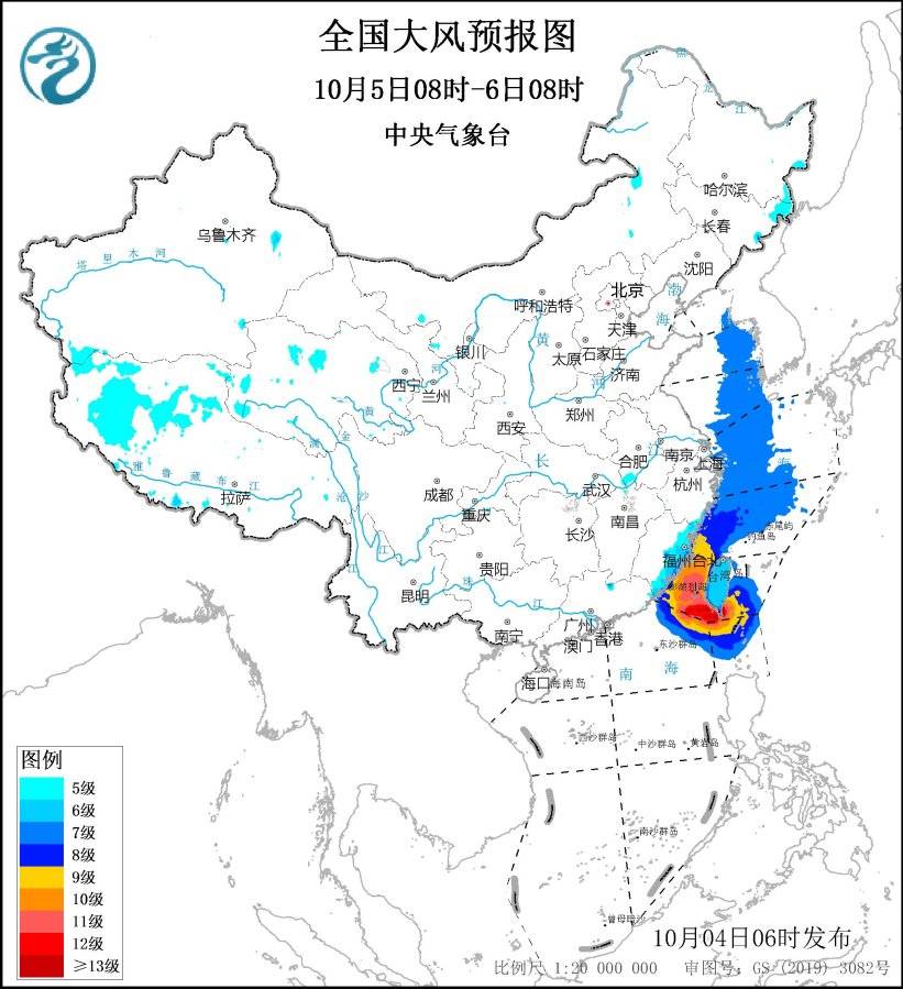 10月5日08时至6日08时,东海西南部海域、台湾海峡、台湾以东洋面、巴士海峡、南海东北部偏北海域将有8~9级、阵风10~11级的大风,其中台湾海峡、台湾以东洋面、巴士海峡的部分海域风力可达10~12级、阵风13~14级,台风“小犬”中心经过的附近海域风力可达13~14级、阵风15~16级,黄海东部海域、东海西北部海域将有7级、阵风8级的大风;西藏西部将有5~6级、阵风7级的大风,浙江沿海、福建沿海、台湾岛将有6~8级、阵风9级的大风。