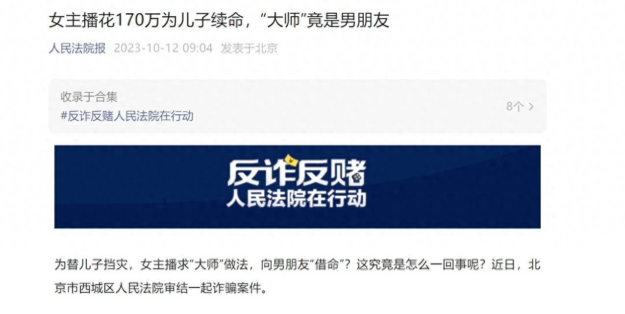 10月12日,据人民法院报微信公众号:近日,北京市西城区人民法院审结一起诈骗案件。为替儿子挡灾,女主播求“大师”做法,向男朋友“借命”?这究竟是怎么一回事呢?