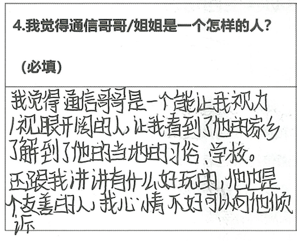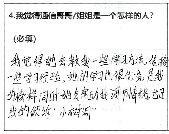 所以当了解到公司开展的“蓝信封项目”是通过建立一对一书信陪伴给予乡村儿童心理支持,我非常踊跃地报名成为了一名通信大使。我想给孤独的乡村孩子们更多关爱和陪伴,哪怕只是一些温暖瞬间也好。