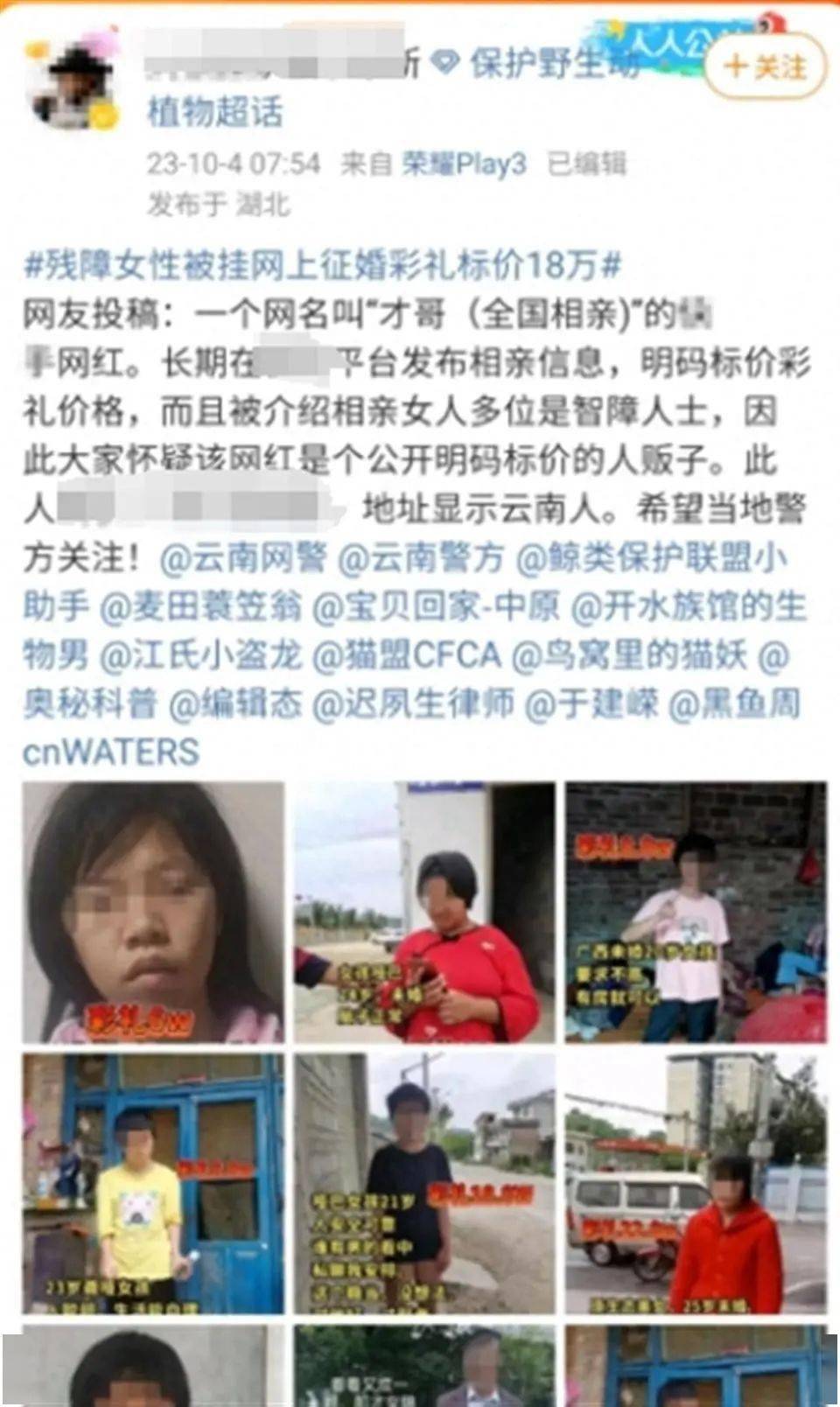 此前有网友举报称,一位名为“才哥(全国相亲)”的短视频博主在自己的账号中,发布了不少残障人士的征婚消息,且彩礼明码标价。一则视频中标注:“彩礼18.8万元,农村女孩21岁,八成智商,听话,能踏实过日子。”另外的征婚视频中,也不乏智力障碍、身体残障的女子被标注彩礼。