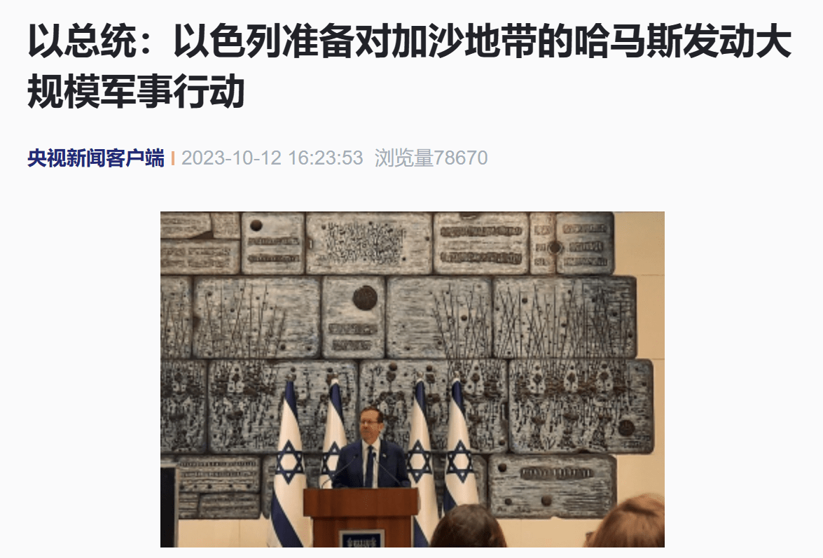 另据央视新闻援引《以色列时报》12日报道,以色列总统赫尔佐格在耶路撒冷总统官邸发表的讲话中表示,以色列正在准备对加沙地带的巴勒斯坦伊斯兰抵抗运动(哈马斯)发动大规模军事行动。