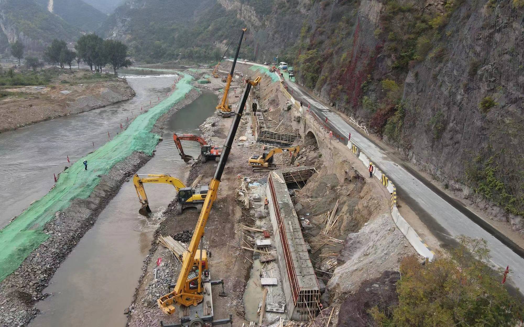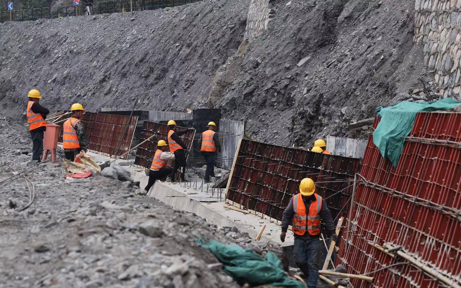 在施工现场,人员往来忙碌,机械运转不停,距离公路几十米就是河道,洪灾后混浊的河水,如今已逐渐变得清澈,水的流速很快,但河道内依旧有大量碎石堆积。在河床与正在修复的公路之间,是一道片石混凝土挡墙。