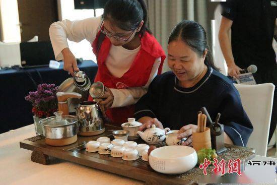参加活动的盲人在志愿者帮助下泡茶。 饶麦淇 摄