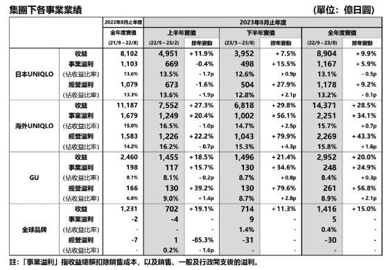 GU事业部2023财年收益总额为2952亿日元,同比增长20.0%,经营溢利总额为261亿日元,同比增长56.8%。在收益大幅增长下,透过加强经费控制,使销售、一般及行政开支占收益比率获得改善,经营溢利率同比上升2.1个百分点。