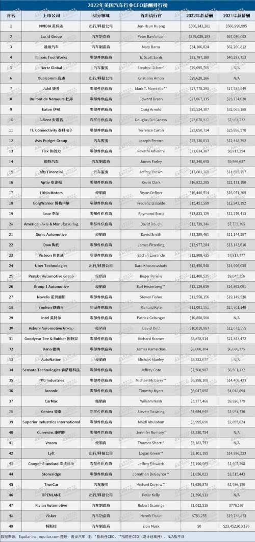 日前,美国汽车新闻(Automotive News)和Equilar公司联合发布了汽车行业相关公司首席执行官薪酬(CEO Compensation)调查报告,汇总了美国49家汽车制造商、零部件供应商、出行/科技公司、汽车经销商以及汽车服务公司CEO的薪酬情况,总薪酬包含基本工资、行使股票期权的收益、股票奖励的收益、现金奖金以及其他形式的薪酬。Equilar的调查还包括股权奖励的变现价值,因此,该机构提供的薪酬可能与监管文件中报告的总薪酬不同。