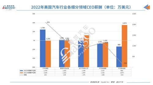 就不同的细分领域来看,2022年,美国汽车服务公司的CEO最赚钱,薪酬平均值为1,760万美元,同比上涨41%;其次是零部件供应商的CEO们,薪酬中位数较2021年也实现了微增;而出行/科技公司、汽车经销商以及汽车制造商的CEO们的薪酬则较2021年出现了不同程度的下降,其中属车企CEO们最“惨”,薪酬较2021年打了半折。